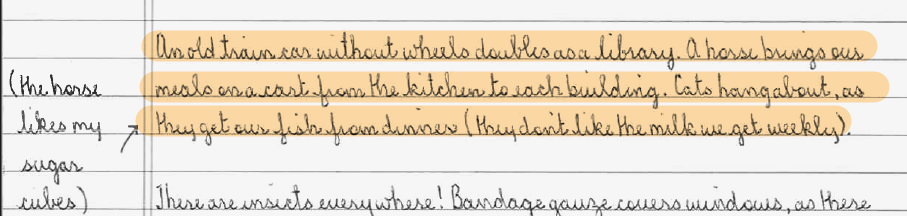 "Há armários antigos e quebrados ao lado das nossas camas para efeitos pessoais. Não há cadeiras em nenhum lugar aqui", lia-se na mesma carta. "Um velho vagão de comboio sem rodas faz às vezes de biblioteca. Um cavalo traz as refeições num carrinho da cozinha para cada edifício".