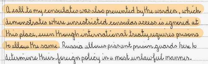 "Nos últimos 30 dias, só me foi permitida uma chamada para casa e uma chamada para o consulado. Deveria ser permitido fazer uma chamada para casa por dia e ter acesso irrestrito aos meus consulados. A Rússia tenta bloquear o acesso", escreveu.